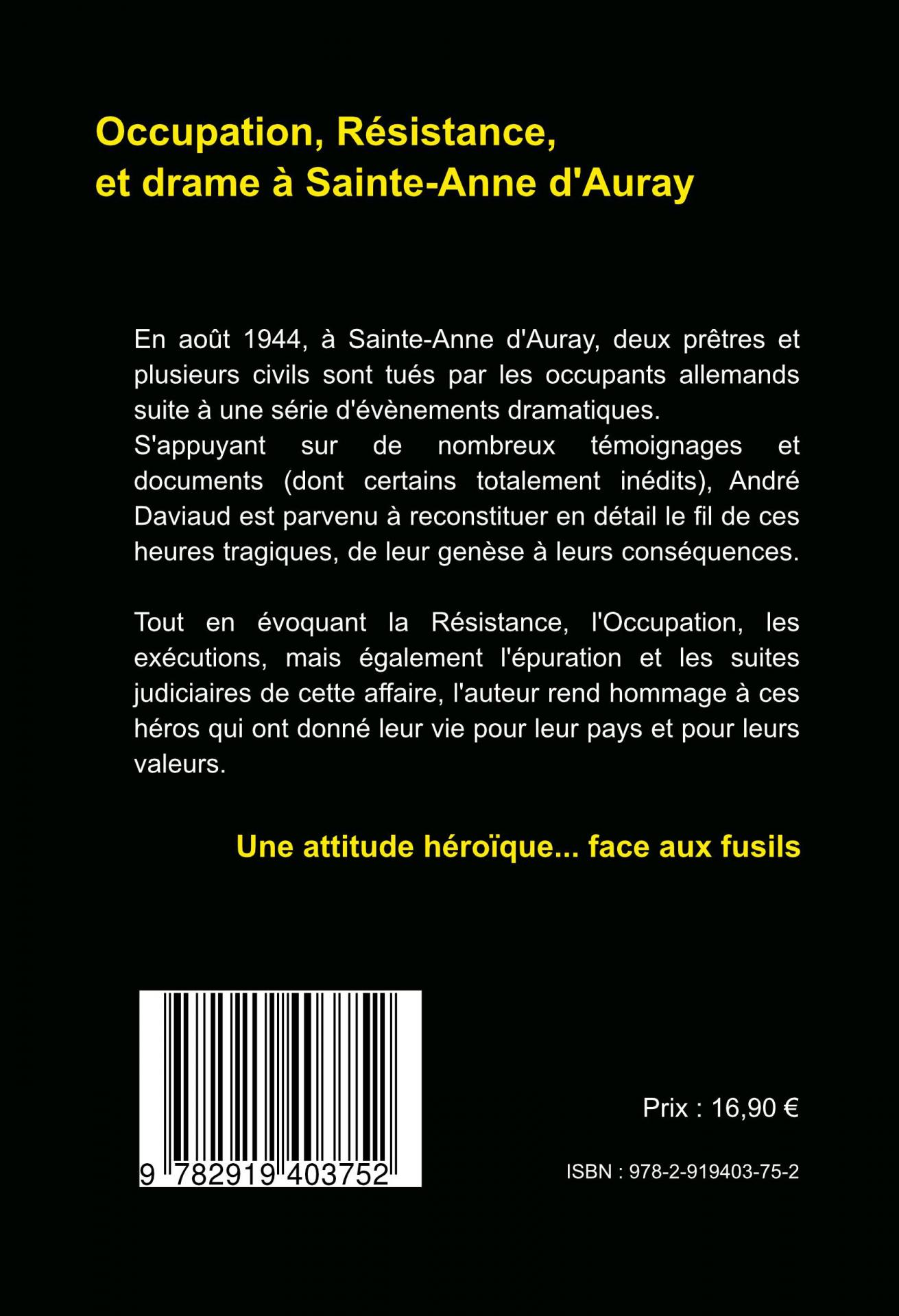En août 1944, à Sainte-Anne d'Auray, deux prêtres et plusieurs civils sont tués par les occupants allemands suite à une série d'évènements dramatiques. S'appuyant sur de nombreux témoignages et documents (dont certains totalement inédits), André Daviaud est parvenu à reconstituer en détail le fil de ces heures tragiques, de leur genèse à leurs conséquences. Tout en évoquant la Résistance, l'Occupation, les exécutions, mais également l'épuration et les suites judiciaires de cette affaire, l'auteur rend hommage à ces héros qui ont donné leur vie pour leur pays et pour leurs valeurs.
